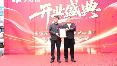 品牌传递,品质承诺!在品牌特许经营授牌环节,中德家系统门窗总经理王庆丰先生为阳泉品牌店总经理田虎平先生授予品牌特许经营授权牌。这块沉甸甸的牌匾,不仅是中德家对阳泉市场的信任,更是一份 “品质承诺” 的接力,同时也象征着田虎平先生将肩负起传递中德家精工品质的重要责任,现场掌声雷动,礼炮飞升,共同庆祝这一精彩时刻。