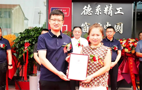 庆典上,中德家系统门窗总经理王庆丰先生为他们授予品牌特许经营授权牌。这不仅是一块牌匾,更是一份 “品质承诺” 的接力棒,承载着责任与信任。